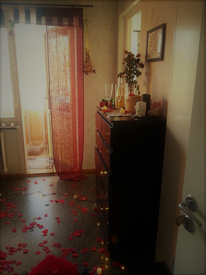 Min plan var att jag skulle dekorera hallen och sovrummet och överraska när min pojkvän kom hem från jobbet på eftermiddagen. Jag pluggade mycket hemifrån och räknade med att kunna hinna med en hel del innan han kom hem. Jag planerade varje detalj. I ett halvår samlade jag på mig vackra föremål, samlade ihop kärleksförklaringar vi skickat till varandra under åren och ordnade med varje detalj. Så när dagen väl var inne kunde jag förvandla vårt hem till ett hav kärlek med av “levande ljus” (kattsäkra led- ljus) glittrande hjärtkonfetti och tusen rosenblad utspridda över lägenheten. Vår katt fick på sig en vit krage som såg ut som slaget på en skjorta med svart fluga. Han blev mycket stilig! Jag beställde en stor bukett med blommor som på blomsterspråk betydde: Vill du gifta dig med mig?